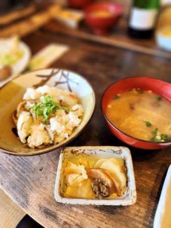 季節の食材を生かした前菜から野菜盛り合わせ、天然野生肉や炭火焼川魚の塩焼き、しいたけ串焼きに名物きのこめし&きのこ汁、新香やデザートも付いて充実の内容です。