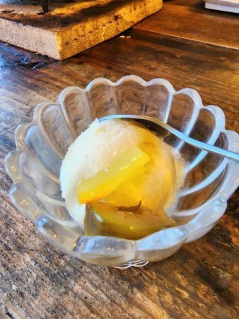 〆に優しい風味の名物きのこめしときのこ汁、新香をいただき、採れたて柚子で作る柑橘感たっぷりのシャーベットでフィニッシュ。とっても満足のコースでした♪