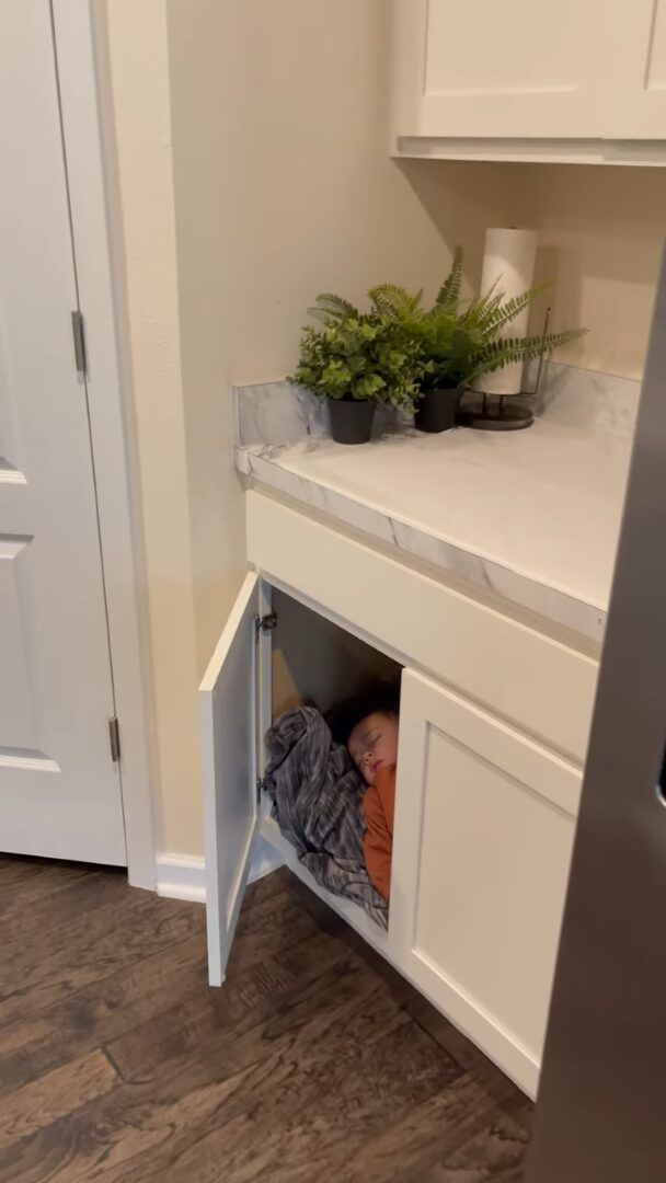 ふたりを捜すためにママが向かった場所はキッチン。 なんでも、女の子はひんやりと冷たいキッチンキャビネットの中に潜り込むのが大好きなんだとか。