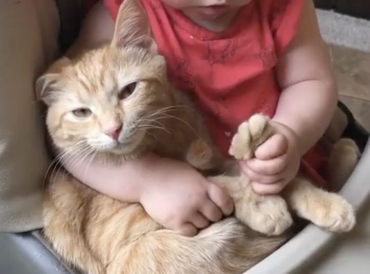 肉球プニプニプニ! 赤ちゃんにどんな触り方をされても怒らない猫さん。