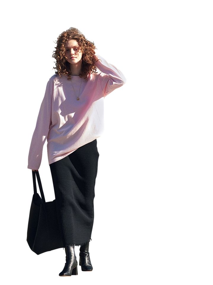 タイトなニットスカートにかぶせるように合わせた、かわいいピンクのロンT。オーバーサイズでウエストまわりまでカバーする、トップスはスキニーなボトム全般に似合う1枚は欲しい逸品。バッグとブーツも冬のままレザーでそろえてもトップスのおかげで、「次」を感じるスタイリングに。