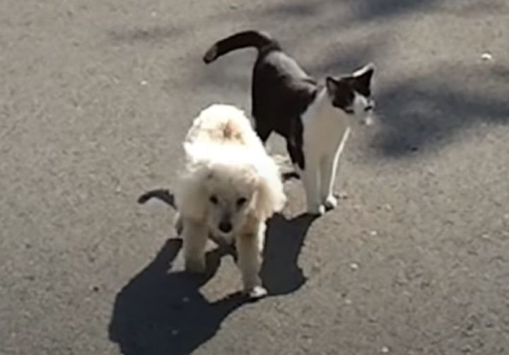 優しい猫さん、盲目の友達犬をお家まで案内してくれる。