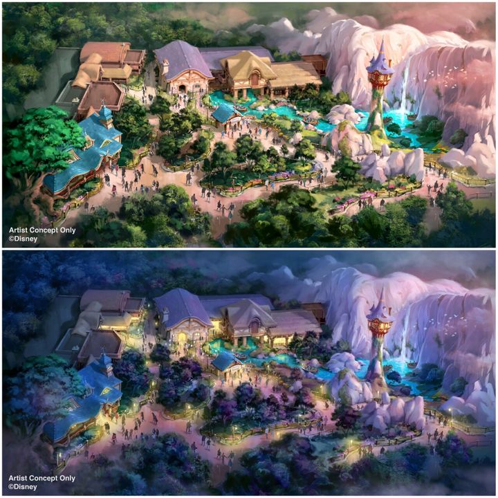 ▲上:「ラプンツェルの森」全景(昼)、下:「ラプンツェルの森」全景(夜) ※画像はイメージ ©Disney