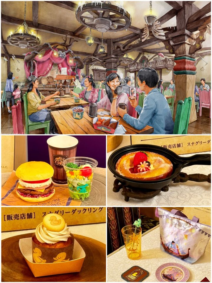 映画に登場する愉快な荒くれ者たちの酒場をテーマにしたカウンターサービスのレストラン「スナグリーダックリング」。店内は、映画の世界を再現する酒場や馬小屋などをイメージした部屋に分かれ、この酒場の愛すべき荒くれ者たちの夢をかなえた幸せな物語が示された装飾がされています。看板のアヒルをイメージした黄色のバンズのワイルドな4種のハンバーガーをメインに、フライパンをイメージした容器に盛り付けられたデザートなど、映画の世界を感じながらお食事が楽しめます。