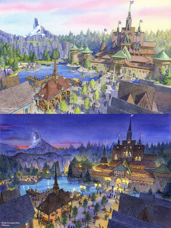 ▲上:「フローズンキングダム」全景(昼)、下:「フローズンキングダム」全景(夜) ※画像はイメージです ©Disney