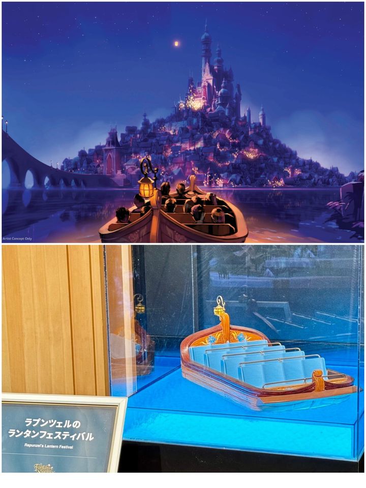 ▲上:「ラプンツェルのランタンフェスティバル」の内観 ※画像はイメージ ©Disney、下:ボートの模型