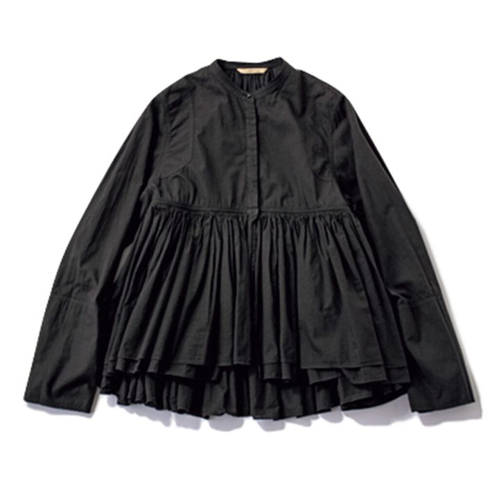 ハリと光沢があるので1枚で着映え感あり。オールブラックでまとめてもほんのり甘く大人可愛い雰囲気に。ジャカードなのに洗濯機で洗える手軽さも◎。¥13,000(PLST)