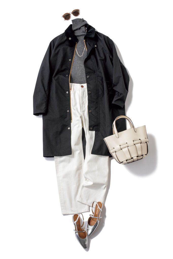 キレイめにもカジュアルにも着回せるロング丈の黒コート。寒暖差の激しい今時季にこの厚さのアウターは重宝します。¥51,700(バブアー/バブアー パートナーズ ジャパン)