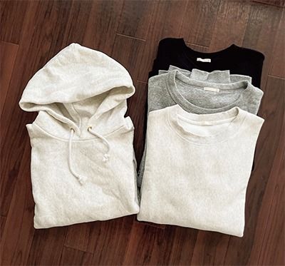 2人の男の子を育てる傍ら、モデル業や食器ブランドのデザインを手掛ける井手祐来さん。彼女が「偶然出会って以降、欠かせない存在になった」と語るのは普遍的なスウェットたち。一見わかりやすい違いはないものの、それぞれを使い分ける用途はしっかりと明確化。何気ないベーシックなアイテムだからこそ「なんとなくでは使い分けない」。集めることが楽しいコレクションもきちんと目的を持つことで、自ずとオシャレを楽しむための実用性も兼ねたメリットのあるワードローブに。