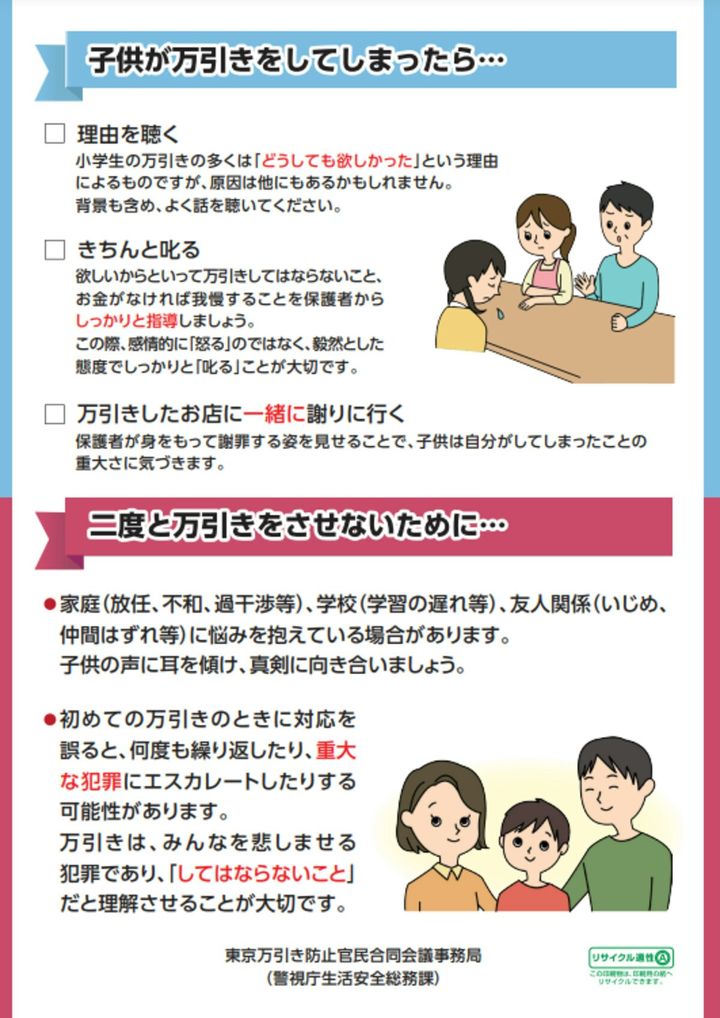 警視庁のパンフレットによると、万引きをした子どもへの対処は「理由を聴く・きちんと叱る・万引きしたお店に一緒に謝りに行く」の3つが必要だといいます。