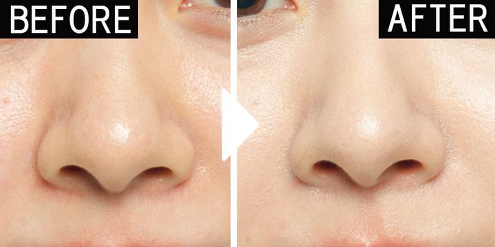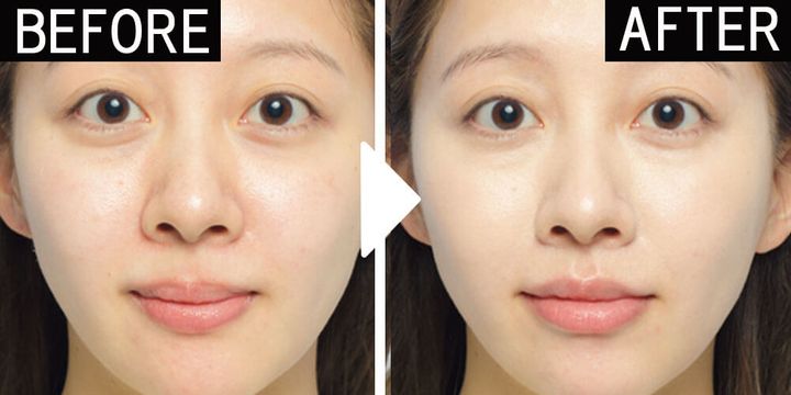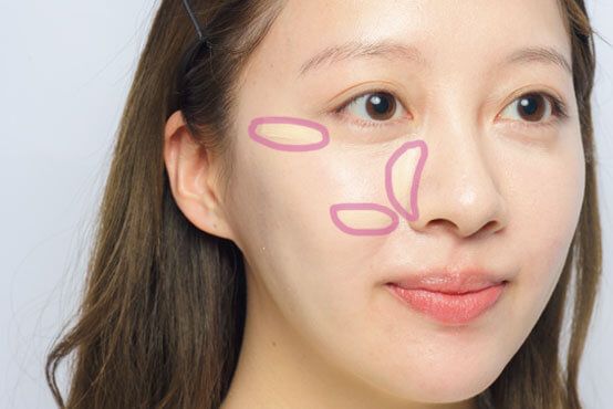 鼻筋横に縦に、ほうれい線の起点から真横に、目尻から真横にのせ、指で広めになじませる。光でリフトアップさせ目くらまし。
