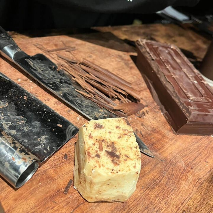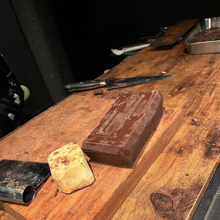 そしてカウンターに店員さんがいらっしゃり、横にはとっても大きなチョコレートと包丁が!