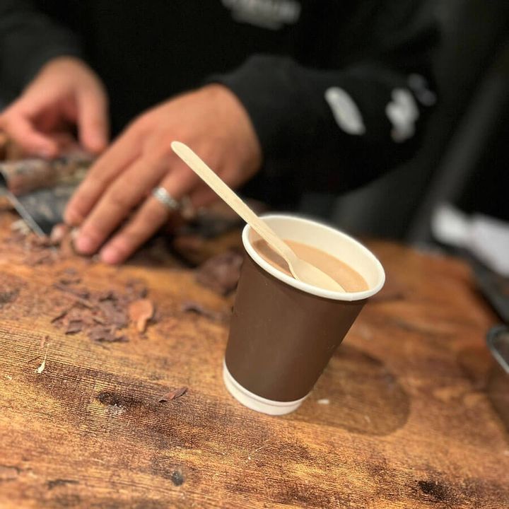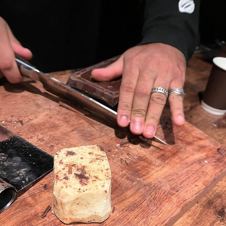 私はコーヒーが大好きで、この日は寒い日だったのでホットチョコレートのコーヒー味を選びました♡ 甘めがいいか、ビターがいいか聞かれたので「ちょっと甘めで」とお願いしました。注文すると店員さんは、まずチョコを切り刻んでいきます。こちらのチョコはすべてベルギー製のチョコレートだそう。