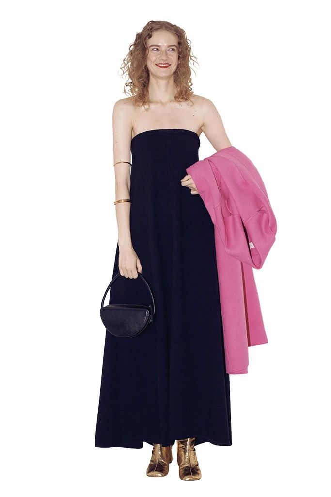 黒ベアロングワンピース 108,900円/ATON(ATON AOYAMA) 黒レザーバッグ 9,900円/パブリック トウキョウ(パブリック トウキョウ 神宮前店) ゴールドショートブーツ 17,600円/ステュディオス(ステュディオス カスタマーサポート) 共布ベルトつきピンクスリットロングコート 110,000円/LE PHIL(LE PHIL NEWoMan 新宿店) ピアス 5,990円、バングル(3本セット) 12,400円/ともにバナナ・リパブリック