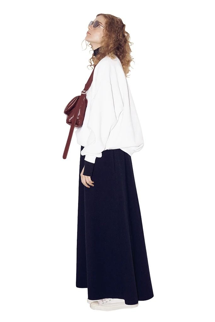 リブタートルの上からワンピを重ねて、さらにその上からルーズなスエットをON。ワンピも素肌の面積もせばめたことでドレス感が和らいで、ゆったりとしたロングスカート風の見え方に。タートルと黒でつなげているから、過ごしやすいのに好感度はしっかりと維持できる。