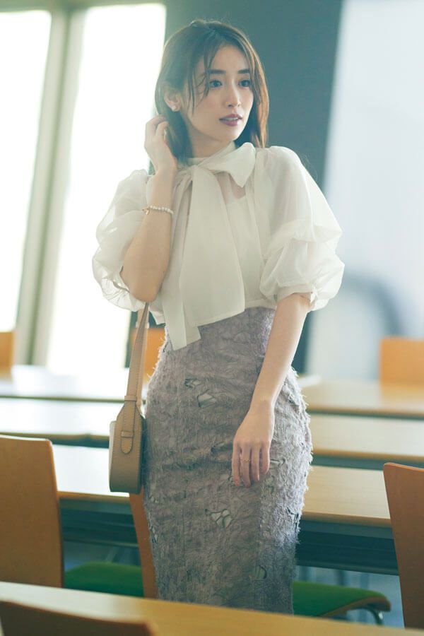 ブラウス¥12,980/LILY BROWN スカート¥23,980/SNIDEL バッグ¥64,900/ジャンニ キアリーニ(ジャンニ キアリーニ 銀座店) イヤリング¥39,600、リング¥47,300/ともにアナプノエ、ブレスレット¥11,550/Hh(以上14 SHOWROOM)