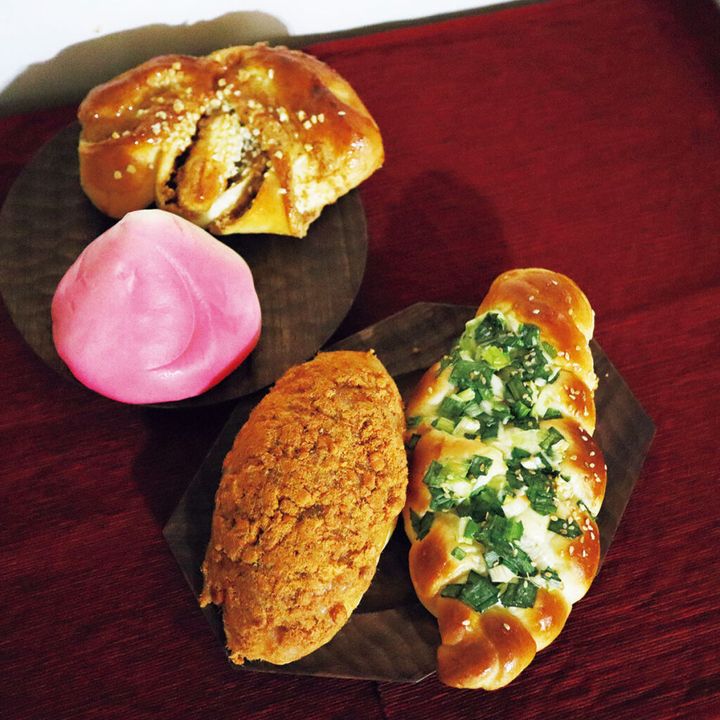 日本の調理パンに影響を受けて作られたという、台湾式の創作心にあふれたパンをご覧になったことがあるだろうか? 50年近く地元民に愛されている老舗のパンと洋・中華菓子の専門店で見つけたのは、写真の右から、宜蘭(ぎらん)産の新鮮な三星ネギを使用した「ネギパン」(38元)、甘じょっぱい肉そぼろがのった「肉鬆(ロウソン)パン」(40元)、長寿祝いに使う「壽桃」(40元)、「ピーナッツパン」(38元)と個性派揃いで、一度食べると癖になるから不思議。「昔と比べてバターの仕入れ価格が7倍になりましたが、変わらない味を提供するために使い続けています」と2代目。店内は子どもからシニアまで「今日は何を食べる?」と嬉しそうに会話する常連客でいっぱいだ。