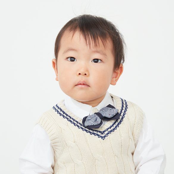 卒入園式はシャツと蝶ネクタイでカッコよく。服装に合わせて髪を整えるなら、赤ちゃんでも使えるスキンケアオイルを使うのがおすすめです。七三スタイルはかっこいいですが、無理に分け目をつけるのはNG。毛量が少ない子どもは、余計ペッタリと見えてしまいます。サイドパートを意識しつつ、その子の毛流れに合わせて分けてあげるとナチュラルな仕上がりに。毛先にオイルをつけてウェットな質感に整えると、いつもと違う雰囲気になります。