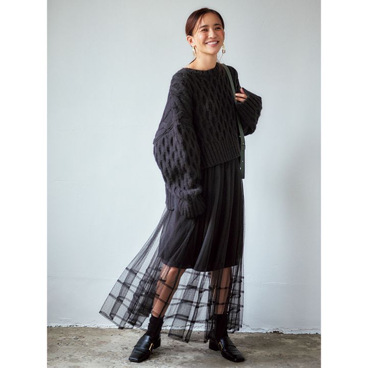 華やかチュールスカートに ケーブルニットで大人の甘さを。 シアー感で全身黒も重たくならない