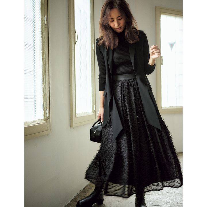 たっぷりのギャザーで 黒コーデがドラマティックに。 スカートで大人の甘さをプラス
