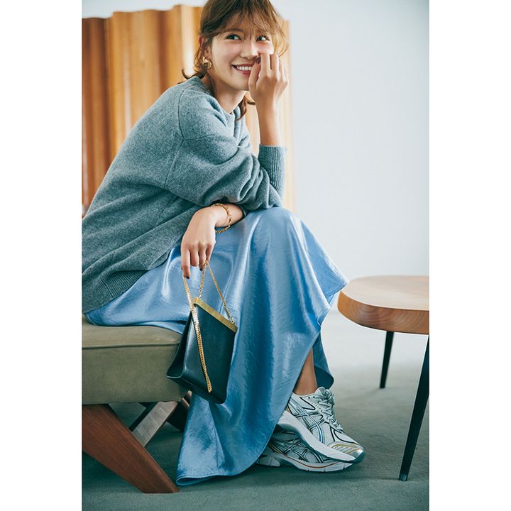 グレーのざっくりニットに サテンスカートのヘルシーMIXが新鮮! シルバーの足元で旬を取り入れて