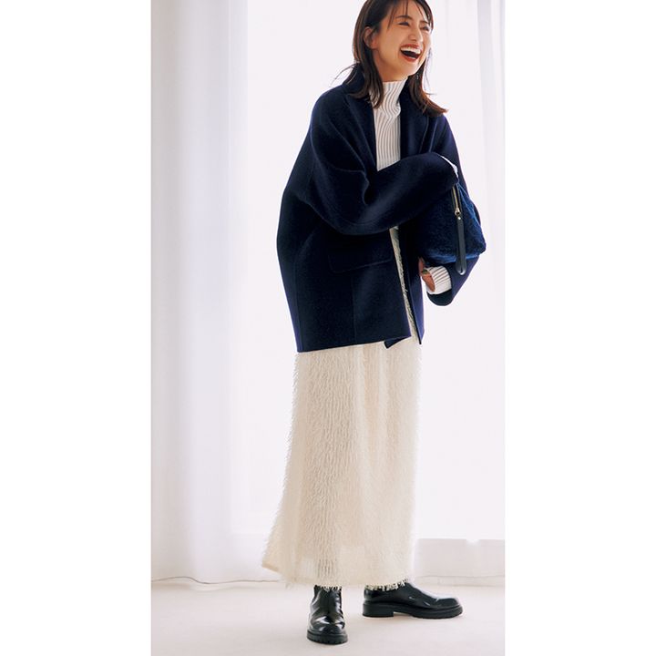 ラメもけ素材の主役スカートで 華やかさと甘さをプラス。 ミドル丈ジャケットで品よくまとめて