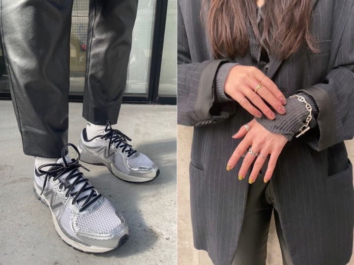 「韓国で買ってきた韓国先行発売のニューバランスのスニーカー。ちょっとダサい感じが好き。ジュエリーをつけてきちんと感をキープ。偏光ピンクのネイルが気に入っています」New balanceのスニーカーは本人私物