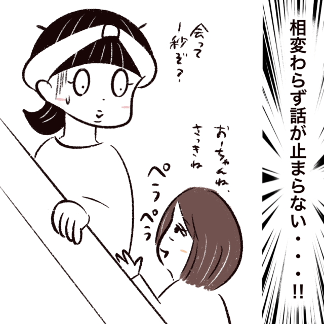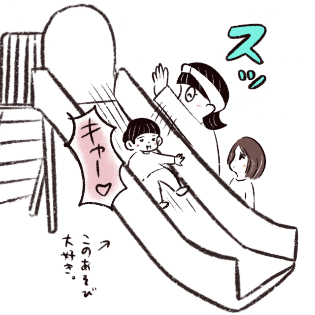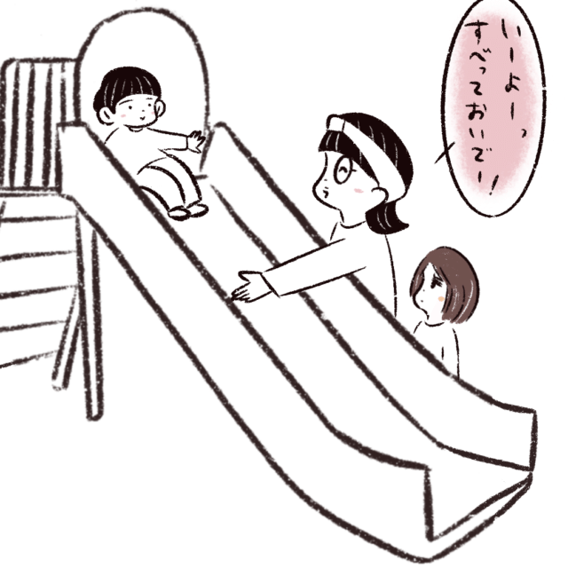 アキと滑り台で遊んでいてもお構いなしに喋り続けるおーちゃん。