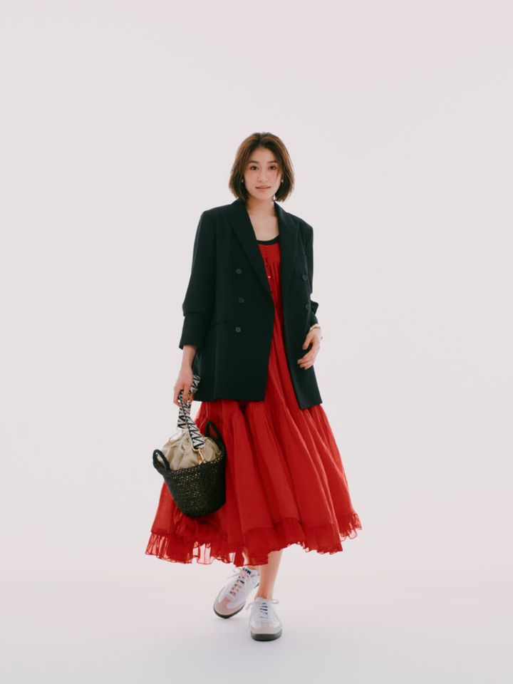 ひらっとドラマチックに揺れるワンピースはジャケット&スニーカーでnotガーリーに。ラバーソールがブラウンなので、着こなしをピリッと引き締めてくれます。