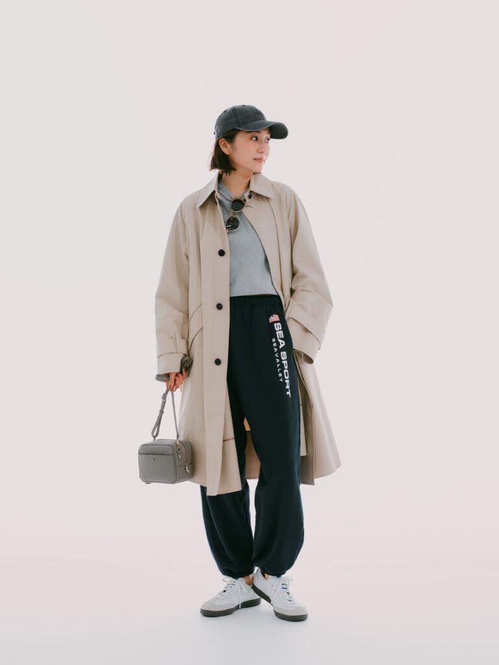スニーカー「SAMBA OG」¥15,400(アディダス オリジナルス/アディダスお客様窓口)コート¥98,450(ギャルリー・ヴィー/ギャルリー・ヴィー 丸の内店)カットソー¥9,900(アンクレイヴ ホワイト/アンクレイヴ)スウェットパンツ¥27,500(シー/S-STORE)バッグ¥37,400(ヴァジック/ヴァジックジャパン)キャップ¥4,620(ニューエラ)サングラス¥37,400(アイヴァン/アイヴァン 東京ギャラリー)