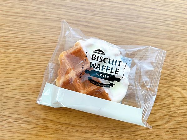 「ビスキュイワッフル ホワイト」ビスキュイ生地を、ワッフル型に焼き上げホワイトチョコで一部をコーティング。口の中でほろほろと崩れていくような食感