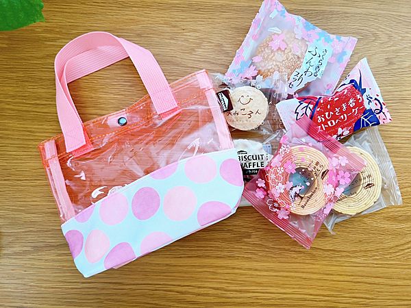 シャトレーゼの前を通りかかったら、なにからピンクのクリアバッグを発見。よくよく見ると焼き菓子が詰め合わせの「スイーツバッグ」でした。春らしいピンクで、クリアバッグはコレだけでもほしい!と思うくらい。