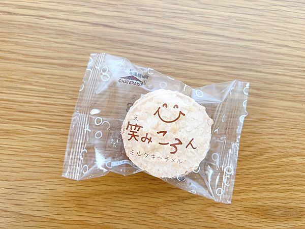 「笑みころん」外はさっくり、中はふんわり食感。アーモンドのダックワーズとミルクキャラメルバタークリームは相性抜群