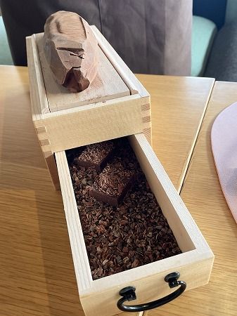 下は、「かつお節生チョコレート」。本格的なかつお節の削り器の上にはなんと、かつお節の形をしたチョコレートが! 削り器の中には生チョコレートが入っていて、上からチョコレートを削ることで完成します。生チョコなんだけれど、ひと口食べるとだしの風味が〝じゅわっ〟。削り器で削る作業も楽しい♪