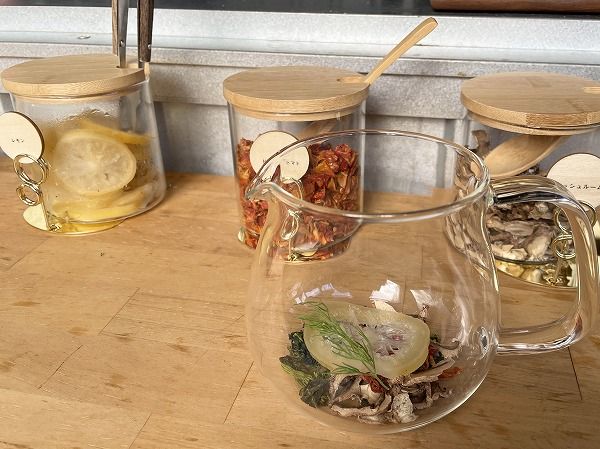 そして3つめが、マッシュルームやレモン、トマトなど、数種類の素材を自分でブレンドして作るだし。今回は、レモン・ホウレンソウ・ニンジン・トマト・マッシュルーム・ディルをセレクトしました(同右)。だしを自分でブレンドできる機会ってほとんどないから、自由に作れるのがうれしいですよね。