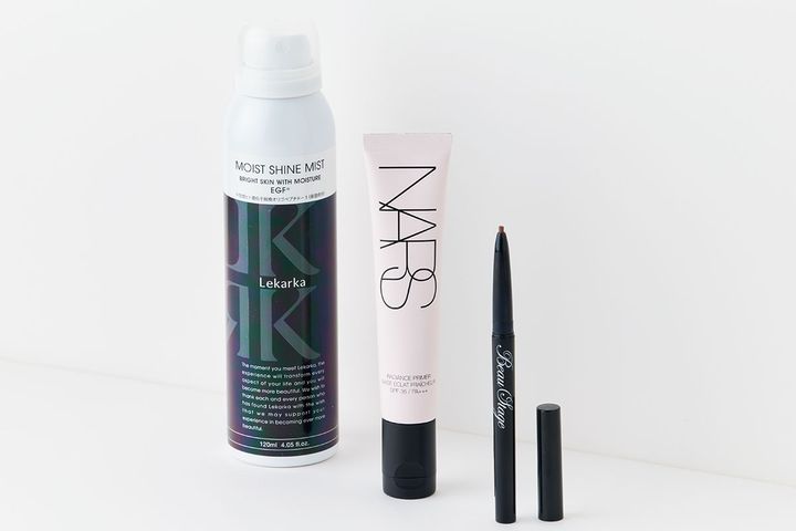 左から:「ブライトニング成分配合で保湿しながら透明肌に」ブライトリーモイストシャインミスト 120ml ¥7,920(レカルカ)、「しっとり感が続いてくすみが消えるので、素化粧ではこの下地とコンシーラーのみ」NARS ラディアンスプライマー SPF35/PA+++ 30ml ¥5,170(NARS JAPAN)、「濃淡を調整しやすく自然な毛流れと影が描けます」ビューステージ アイブロウペンシル ライトブラウン ¥2,530(アデランス)