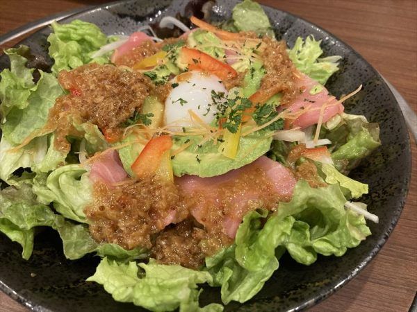 まぐろとアボカドと温泉たまごのサラダ 850円。特製のドレッシングと新鮮野菜、卵が格別おいしかった!
