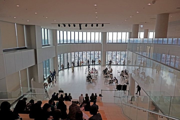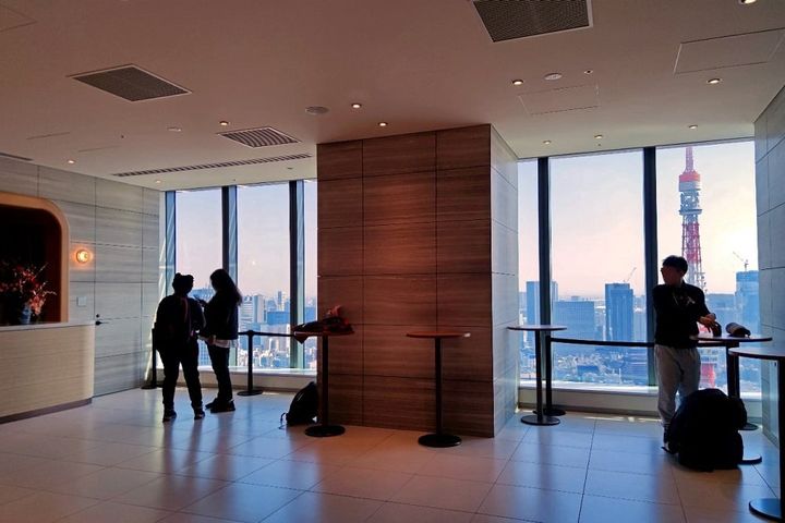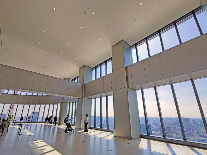 スカイロビー直通のエレベーターを降りると、眼前に広がったのは高層階とは思えないほどの開放的な空間。スカイロビーは吹き抜け構造になっており、窓は2フロアにわたって、南側を中心に孤を描くかたちで半円状に設けられています。そのため、東側にある東京タワー方面から西側にある富士山方面までの広い範囲を一望することができます。