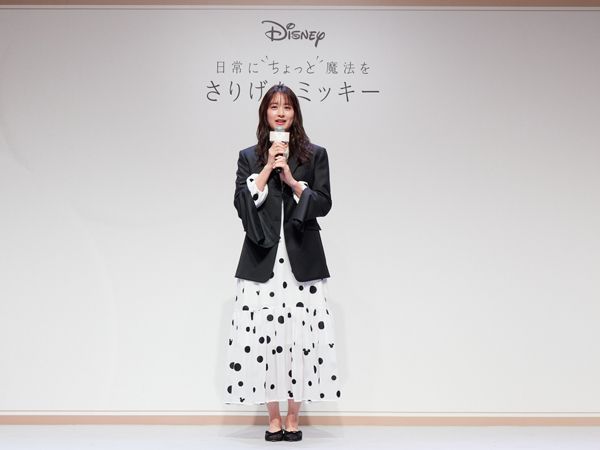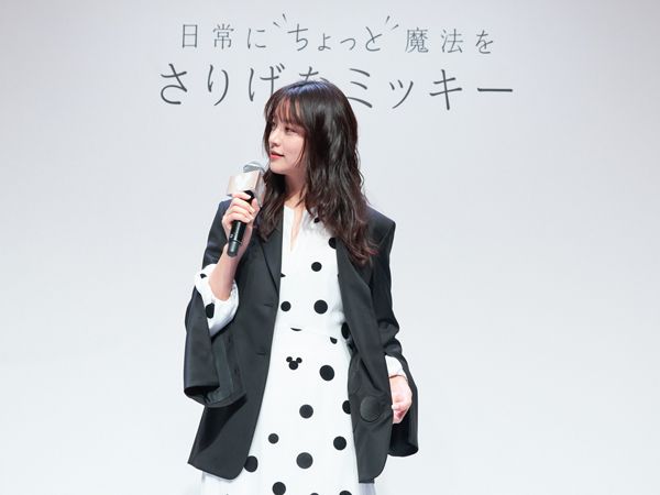 山本美月さんが当日着用していたものも「さりげなミッキー」のアイテム。ドット柄のワンピースにも、よく見るとミッキーが。シックなブラックのジャケットは内側にミッキーが。