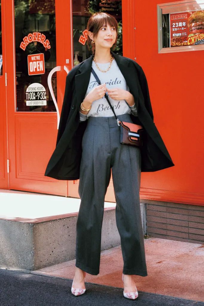 かっちり見えの黒ジャケットは、さらりと肩掛けすることでリラクシーな印象に。インナーには、ロゴTを合わせてカジュアルダウンするのがおすすめです。足元はパンプスで適度に肌見せして春っぽさを醸し出して。