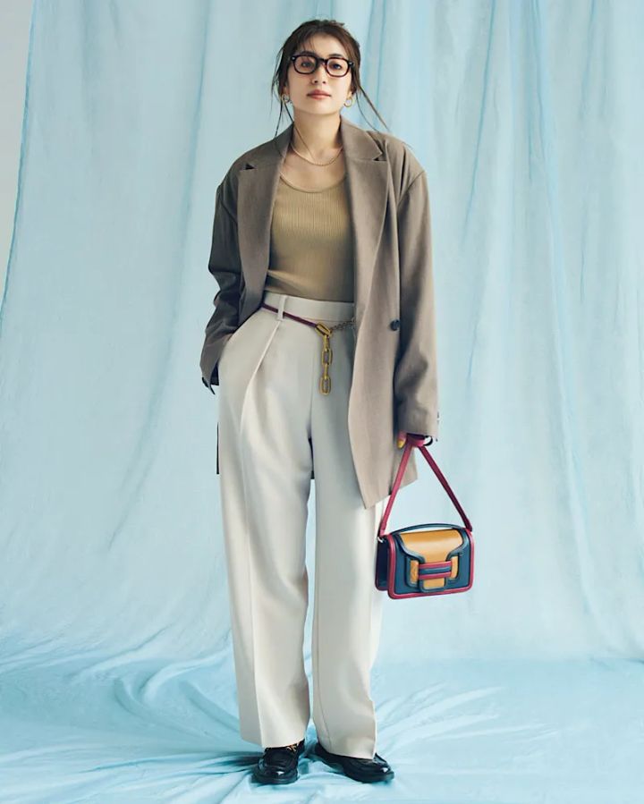ジャケット×パンツの王道コンビこそ、今年はちょっぴりのリラックス感が重要。ほどよくゆとりのあるストレートパンツと、メンズライクなオーバージャケットで、気取らないのに作り込まれた大人の印象に。ベージュのワントーンに、カラフルなミニバッグを合わせてエッジィに仕上げて。