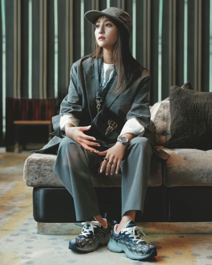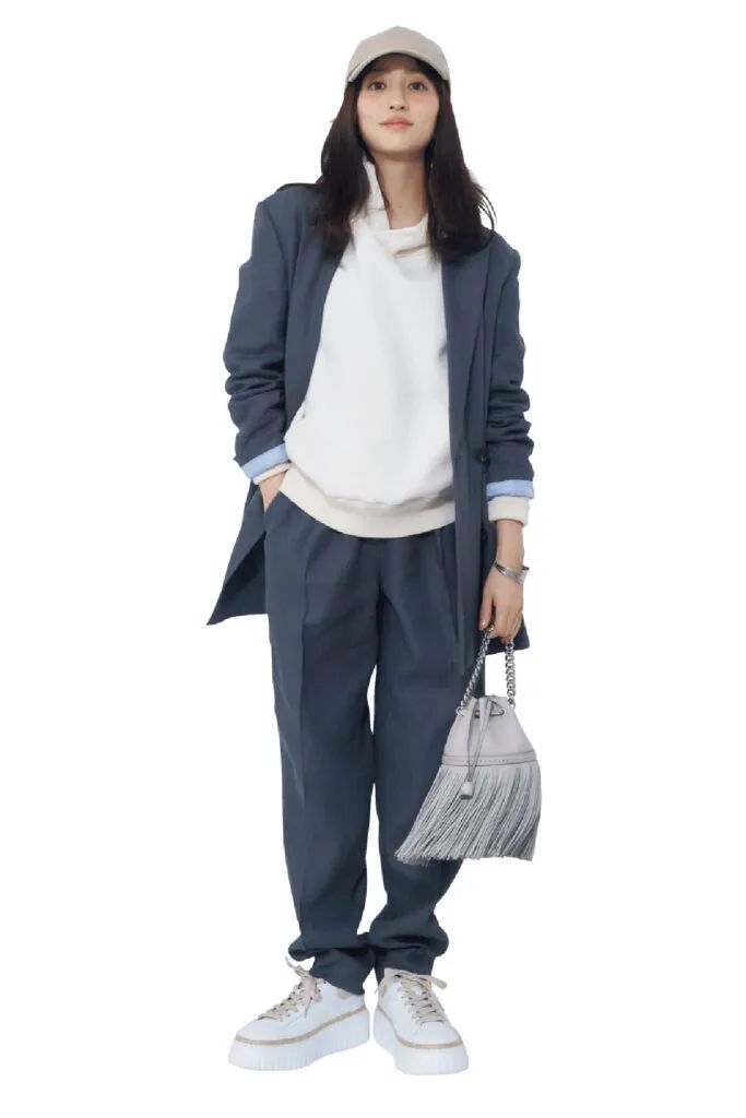 オーバーサイズジャケット×パンツのセットアップは、グレーをチョイスしてハンサムに仕上げて。インナーに白フーディを仕込んだレイヤード感が、今っぽさを加速させます。キャップやスニーカーでスポーティ要素を散りばめるのがこなれ見えのコツ。