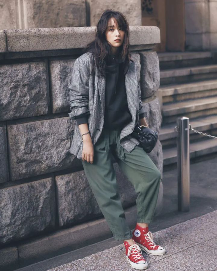 トラッドな雰囲気のチェック柄ジャケットは、カジュアルなアイテムとの組み合わせで新鮮味UP。カーキのコットンパンツでミリタリーなムードを演出し、黒のフーディを合わせれば、ストリートな奥行きが出てメリハリある着こなしが叶います。コーデのスパイスに赤のスニーカーを投入して、地味見えを回避。