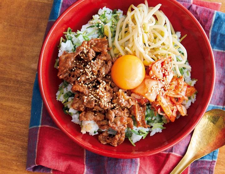 同じフライパンにごま油小さじ1を入れて中火で熱し、牛肉をたれごと入れて、肉の色が変わるまで2分ほど炒める。器に豆苗ご飯を盛り、牛肉、大豆もやし、キムチ、卵黄を等分にのせ、白ごまをふる。