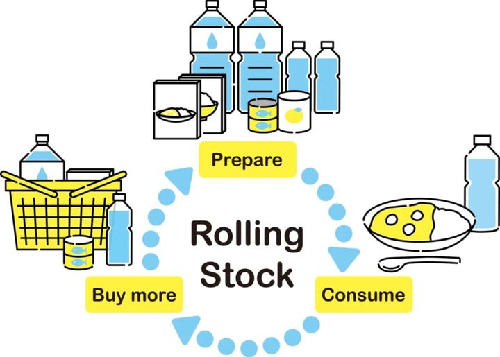 ローリングストック法:普段使い慣れている食材や非常用食品を多めに買って、ストックしている状態を保ちながら使っていき、そのぶんを補充していく(回転させていく)方法。