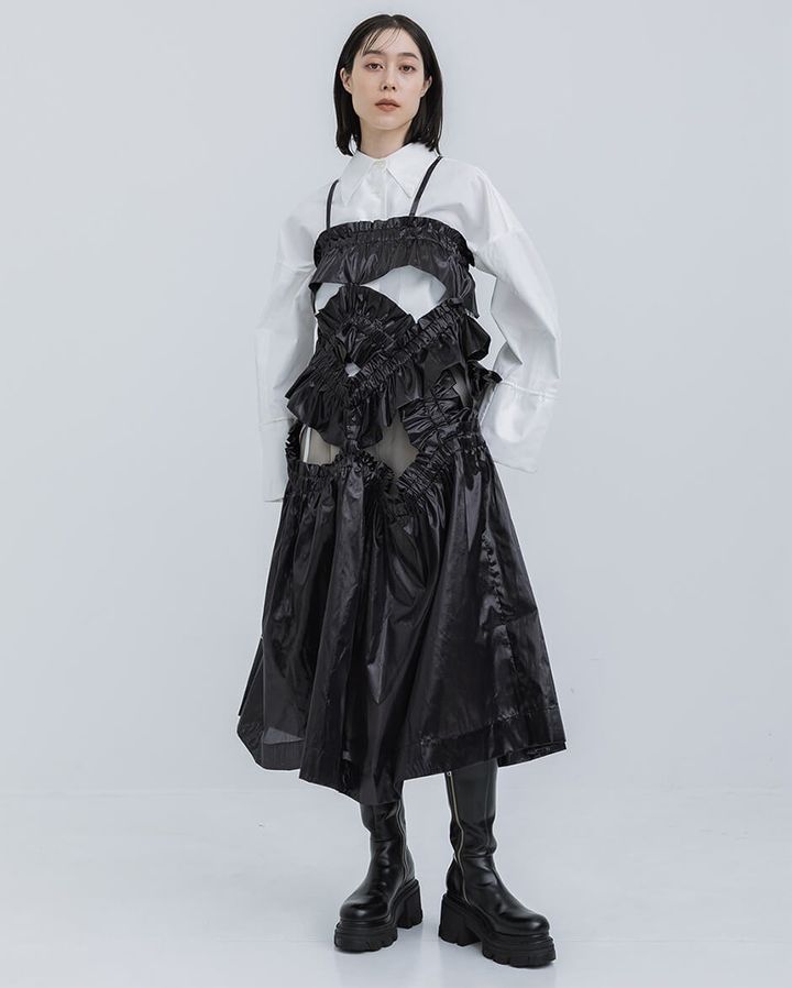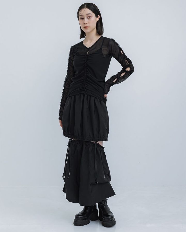 リサイクルナイロンタフタを使用した「twins skirt」は、穴あきデザインのロングスカートとしても、リボンとスナップを外してミニスカートとしても着用でき、自身の感覚で着こなしを楽しめる。