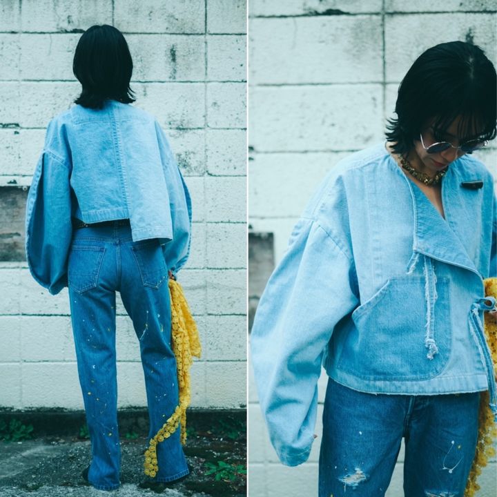 「ジャケットは私のブランド157 woadblue(157ウォードブルー)とハンドメイドアクセサリーブランド、Y.A.Acc(ワイエーアク)さんとのコラボジャケット。異なるウォッシュのデニムを生かした立体感のあるパターンで1枚でとてもサマになります。ほどよい加工感でどんなボトムとも合わせやすいんです」ジャケット¥42,900(157+ワイエーアク)