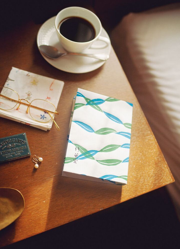 1891年に京都で創業した『老舗手摺匠 竹中木版』。歴史と伝統ある職人の手仕事を、より親しみやすいアイテムとして提案し、竹中木版が展開する〈竹笹堂〉のブックカバー「笹波」は、一枚一枚職人が木版画として摺りあげた和紙を用いたもの。和紙は耐久性も高いので毎日でも使いやすく、水の流れに浮かぶ笹の葉を爽やかな色合いで表現した竹中木版6代目摺師の原田裕子によるデザインが、読書時間を豊かにしてくれる。ブックカバー¥1,595(竹笹堂075−353−8585)眼鏡¥47,300(アヤメ 03−6455−1103)、ピアス¥35,200(テッド・ミューリング/カ ジツ 03−6810−0187)。