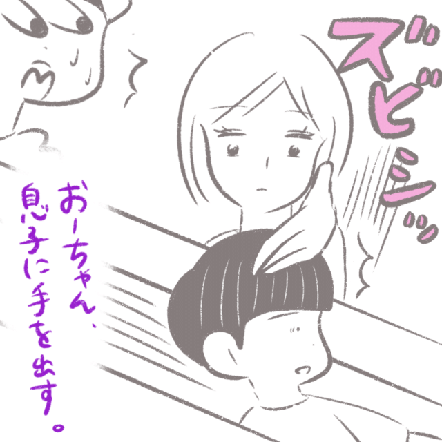 イヤな予感がしつつ遊びに行った夕方の公園、案の定おーちゃんがいたぁーーー!!すぐに見つかって延々に話しかけてくるおーちゃんをそのままに、アキくんとすべり台で遊んでいると、突然「ズビシッ!」とおーちゃんがアキくんの頭にチョップしてきて・・