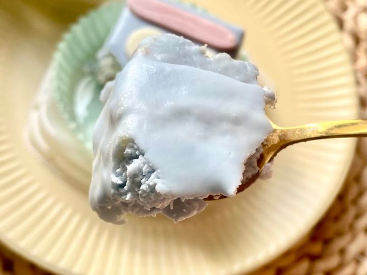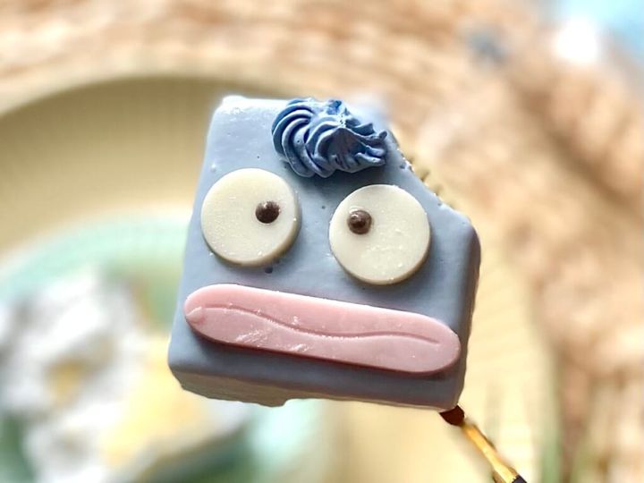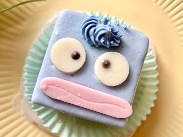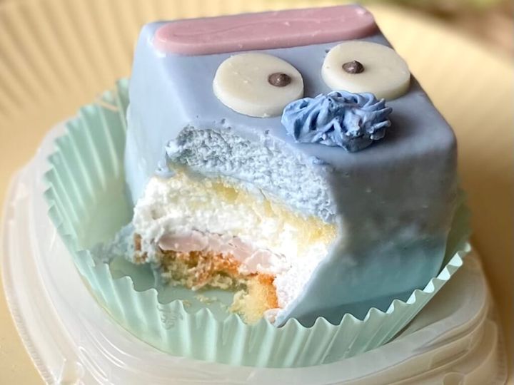フタをとり、ケーキをアップで撮影してみました(笑)。なんたる可愛さ。くちびるも目もチャームポイントです。心の中でごめん! と言いながら、いただいてみると……?